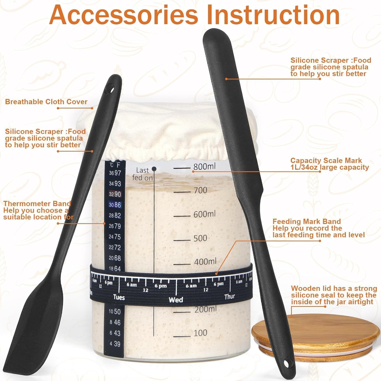 🥫【Large Capacity Glass Jars】The glass jars are made of borosilicate glass, heat and cold resistant. The 34-ounce jar makes it easy to add flour and water and stir the mixture, and it’s also easy to clean. Moreover, the lid has a strong silicone seal to keep the inside of the jar airtight, will not affect the yeast fermentation, and can also keep food fresh and safe. Graduated lines on the glass jar also allows you to check the fermentation status at any time.