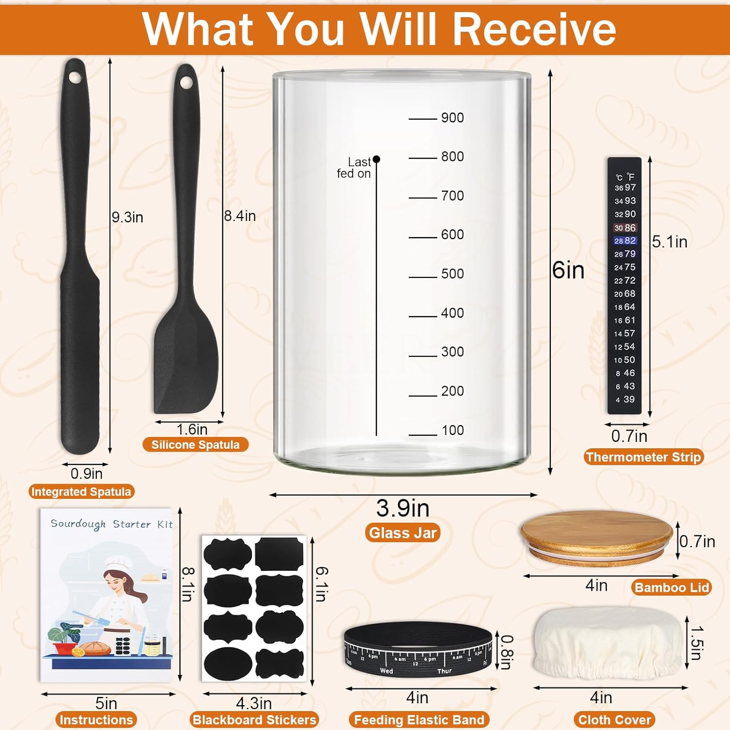 🥖【Sourdough Bread Starter Jar kit with scale】High quality sourdough starter jar kit come with graduated glass jar, thermometer, long silicon spatula, short silicon spatula, chalkboard label stickers, feeding band, breathable cloth cover.