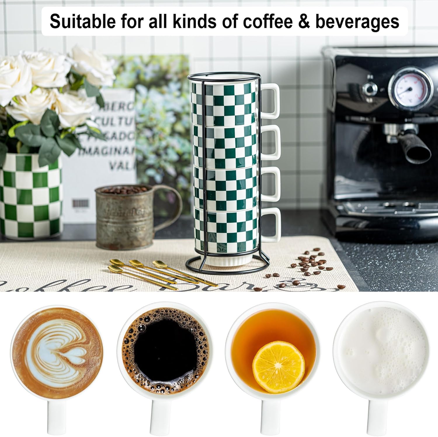 Stackable Coffee Mugs with Stand, Checkered Coffee Mug Set of 4, 11oz Espresso Cups for Beverages, Stacked Mug Set with Spoons for Housewarming Birthday Gift, Dishwasher Safe