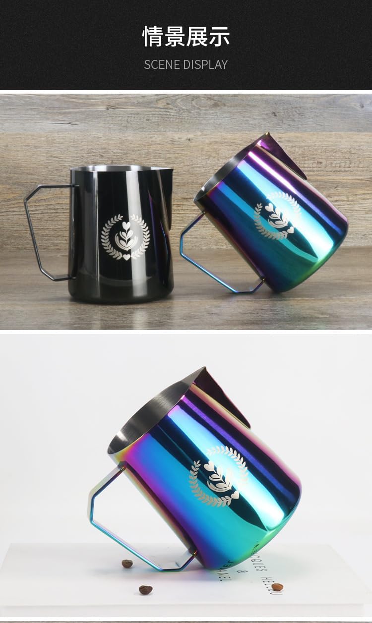 The style of life begins with a cup of coffee. Stainless Steel Milk Frothing Jug Features 1.Wide handle Laser welded, thickened trimmed and polished, comfortable to hold and pull more smoothly 2.Fluted spout with flow control design Sharp spout, notch flow control design makes it easier to control the milk flow rate and more stable. 3.Built-in scale Precise control of the amount of milk without overflowing the cup 4.Stainless steel body Made of 304 stainless steel, carefully ground and polished.