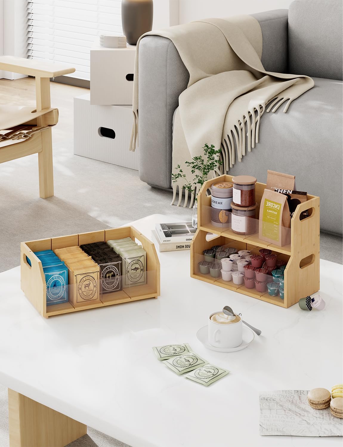 Natural Bamboo Metrial: Made of durable bamboo, and the dividers features a clear Acrylic plastic board that allows for easy identification of desired tea bags, this tea bag holder Equally aesthetic and functional.