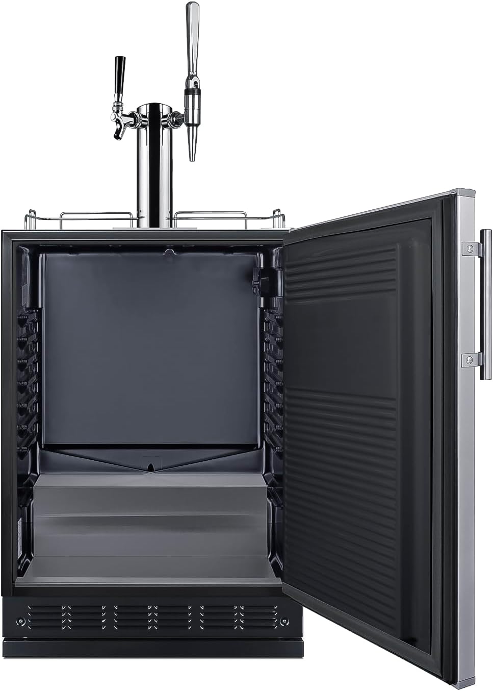 Perfect for your needs: With a 24” footprint, this coffee kegerator is designed to fit under the counter. Inside, the stainless steel floor ensures safer loading of heavy kegs. The kegerator interior includes a Nitrogen tank holder and space for two 1/6 (sixtel) kegs (not included). Nitrogen tank, regulator, dual tap kit with 1 standard handle and one stout style handle, and stainless steel drip tray included.