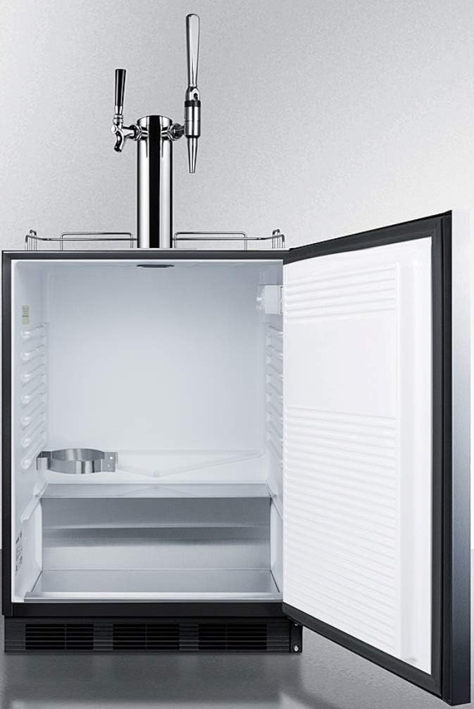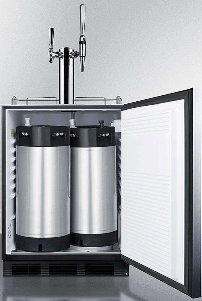 The SBC58BLBIADACMTWIN is a dual tap coffee kegerator designed to serve both nitro-infused and regular cold brew coffee on tap. The front-breathing design allows built-in installation, while the fully finished black cabinet also enables freestanding use.
