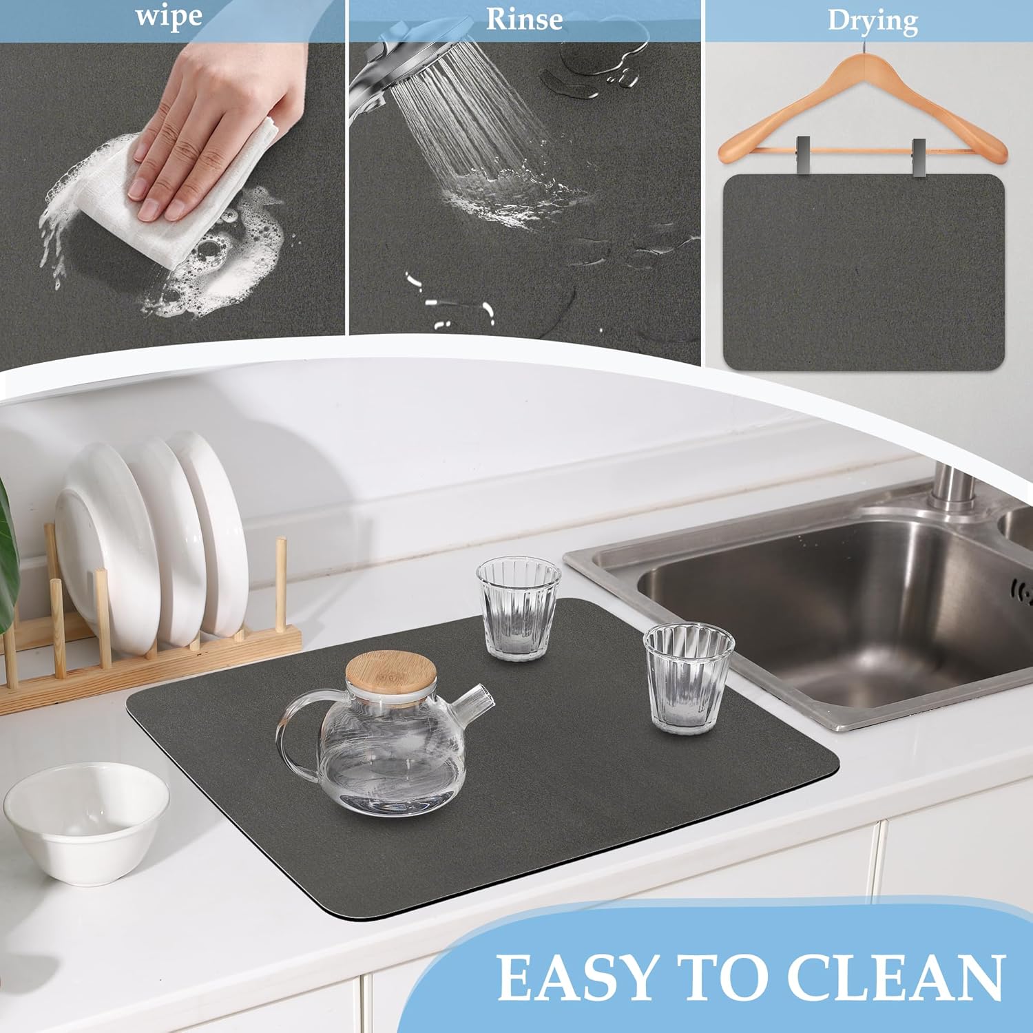 SUPER ABSORBENT:This kitchen drying mat is made of a special material called diatomaceous earth. It’s soft and strong, and it can absorb a lot of water really quickly. It’s also heat-resistant, tear-resistant, and abrasion-resistant. It’s like a little protective angel for your countertops and dishes!