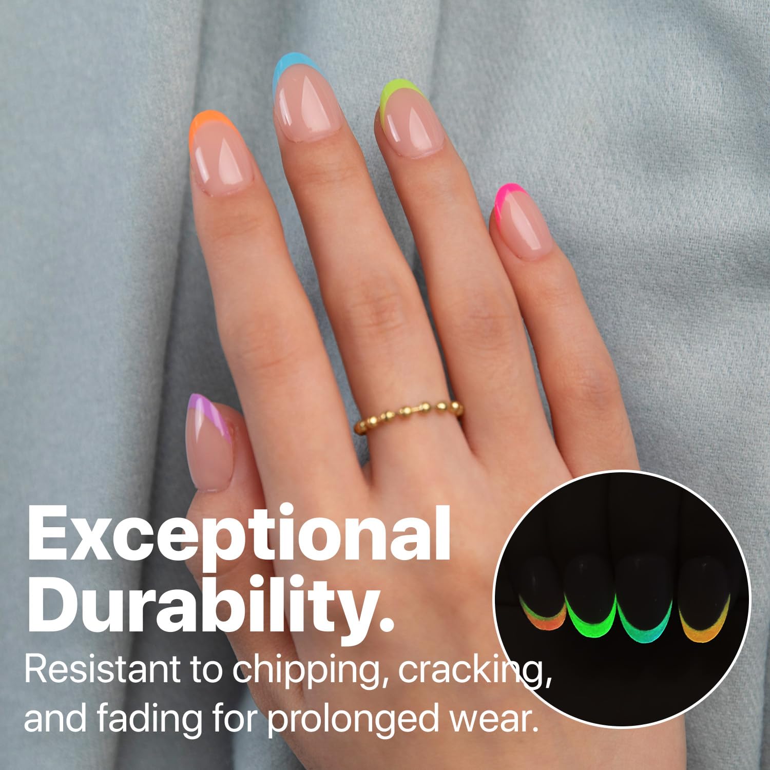 Stunning French Tip Design: Classic French tip press on nails updated with bright pastel tones that glow in the dark, perfect for any occasion.