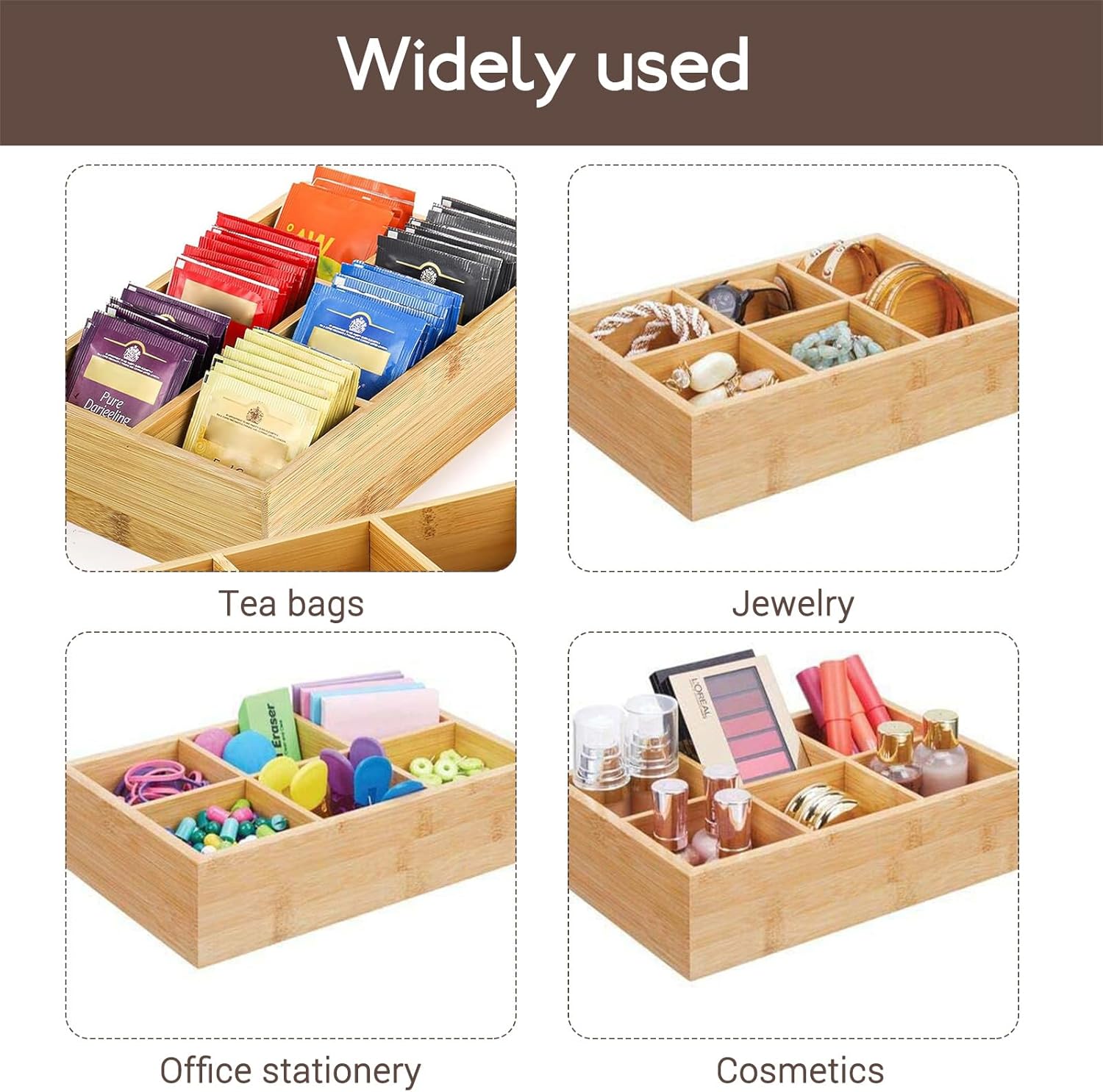 6 dividers.Our food storage box has 6 good sized compartments, perfect for storing different tea bags by type. You can find what you need at a glance.