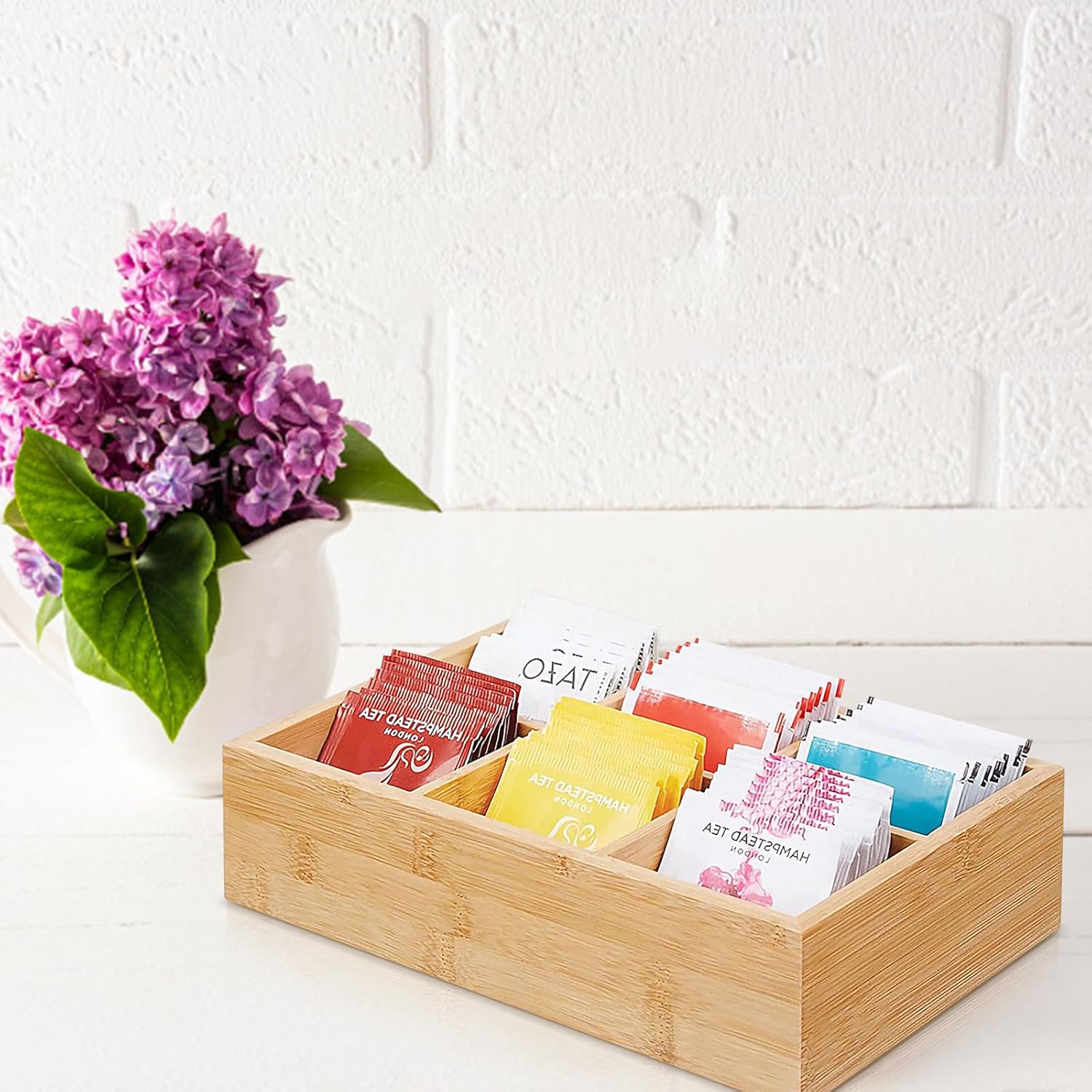 This well-made tea organizer keeps all my different varieties of tea neatly arranged and easily accessible next to my kettle. The sturdy construction makes it ideal for both home and office use. Great way to keep your tea collection organized and within reach whenever you need that perfect cuppa.