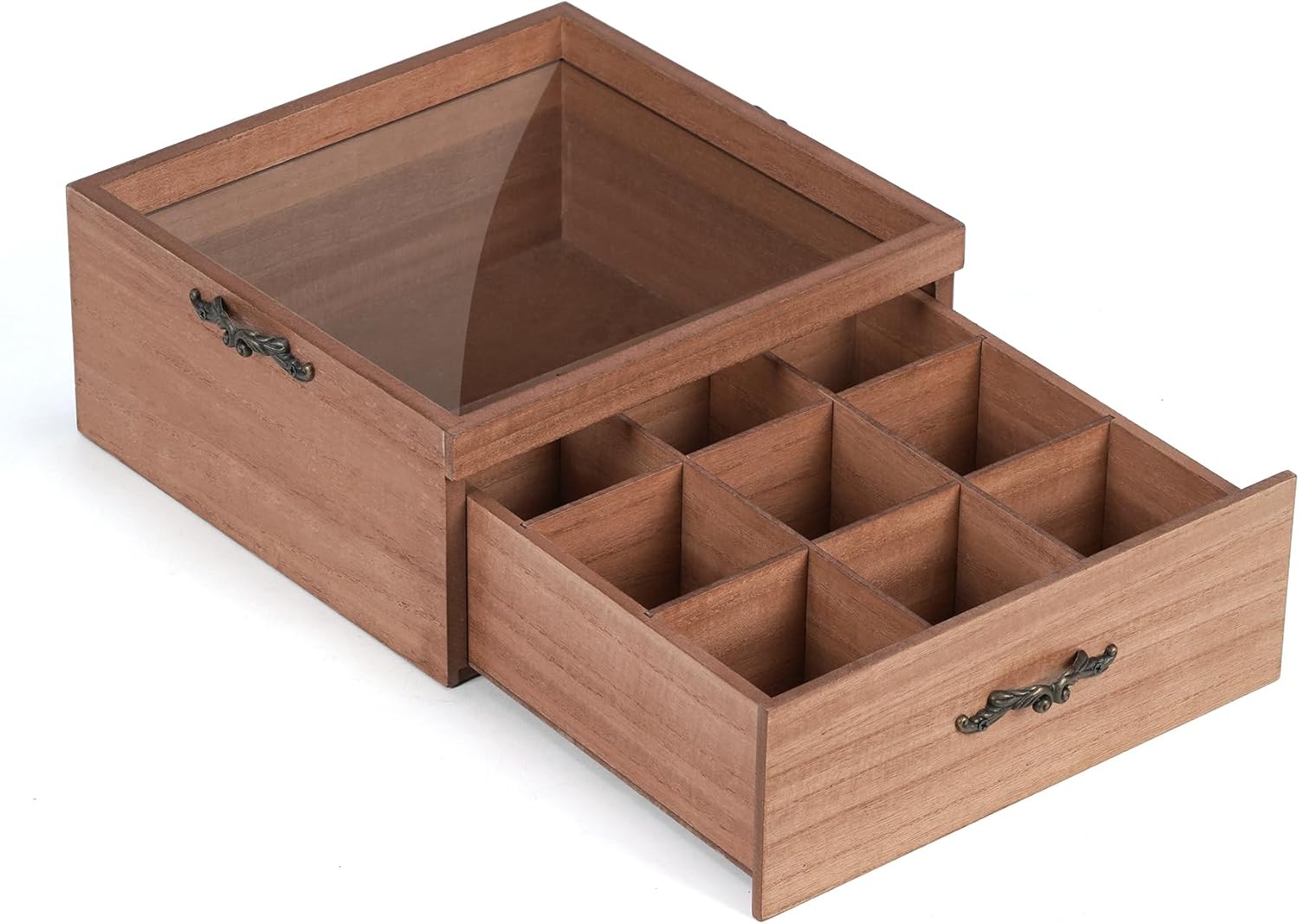 Tea Bag Organizer, Wooden Tea Storage Box, Tea Bag Holder with Drawer & Glass Window, Sugar Packet Holder, Tea Bag Caddy Box, Valentines Day Birthday Gifts for Women, Mom, Her, Men, Dad, Him