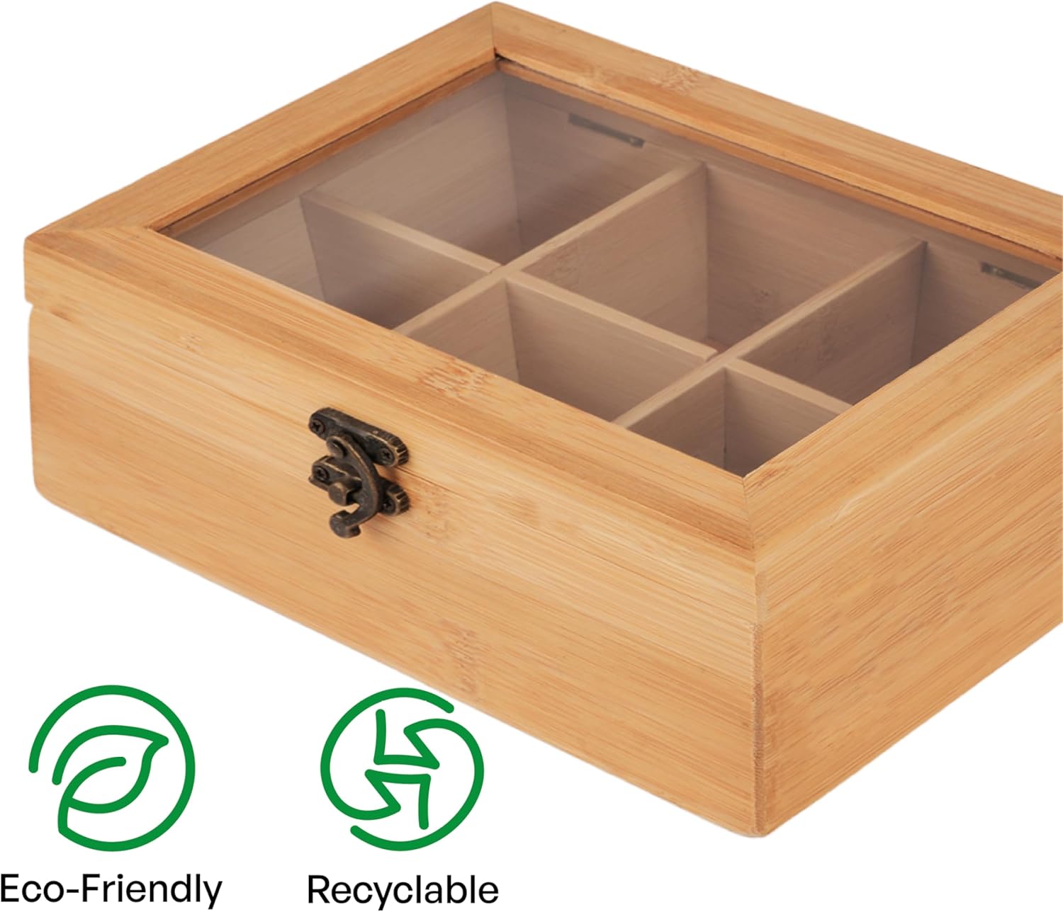 1.Tea Organizers And Storage Elegant Bamboo Construction:This tea storage box, measuring 8.58″ x 6.3″ x 3.54″ and weighing 1.28 lbs, is crafted from durable bamboo. With 6 compartments, it keeps your tea bags neatly organized. The bamboo material adds a touch of elegance to your kitchen while being eco-friendly and sturdy.