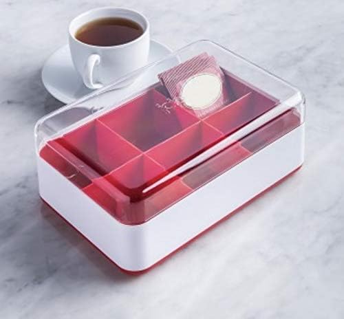 Store and display your single-serve tea packages in this Joie Tea Bag Storage Box. Keep your favorite teas organized with this colorful Tea Storage Box. Featuring 6 sections that each hold 10 teabags, this storage box is made of food-safe plastic materials and comes with a clear plastic top. With it’s compact size, this tea storage box is ideal to keep your tea bags within reach at the office or in a dorm.