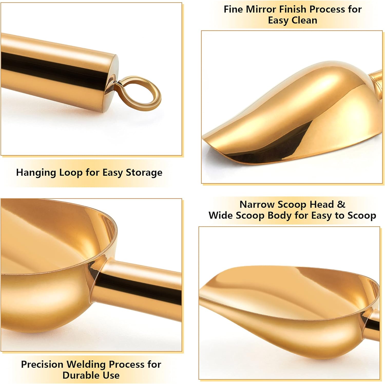 SMOOTH HANDLE: Gold candy scoop with 3 inch longer tubular handle, Humanized design for easily and stably grip, Feel comfortable when holding in hands, Smooth edge avoid hurting hands