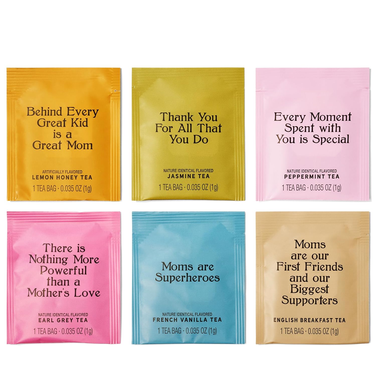 UPLIFTING QUOTES – Tea bag wrappers display 1 of 6 positive expressions and make great daily gifts for mom