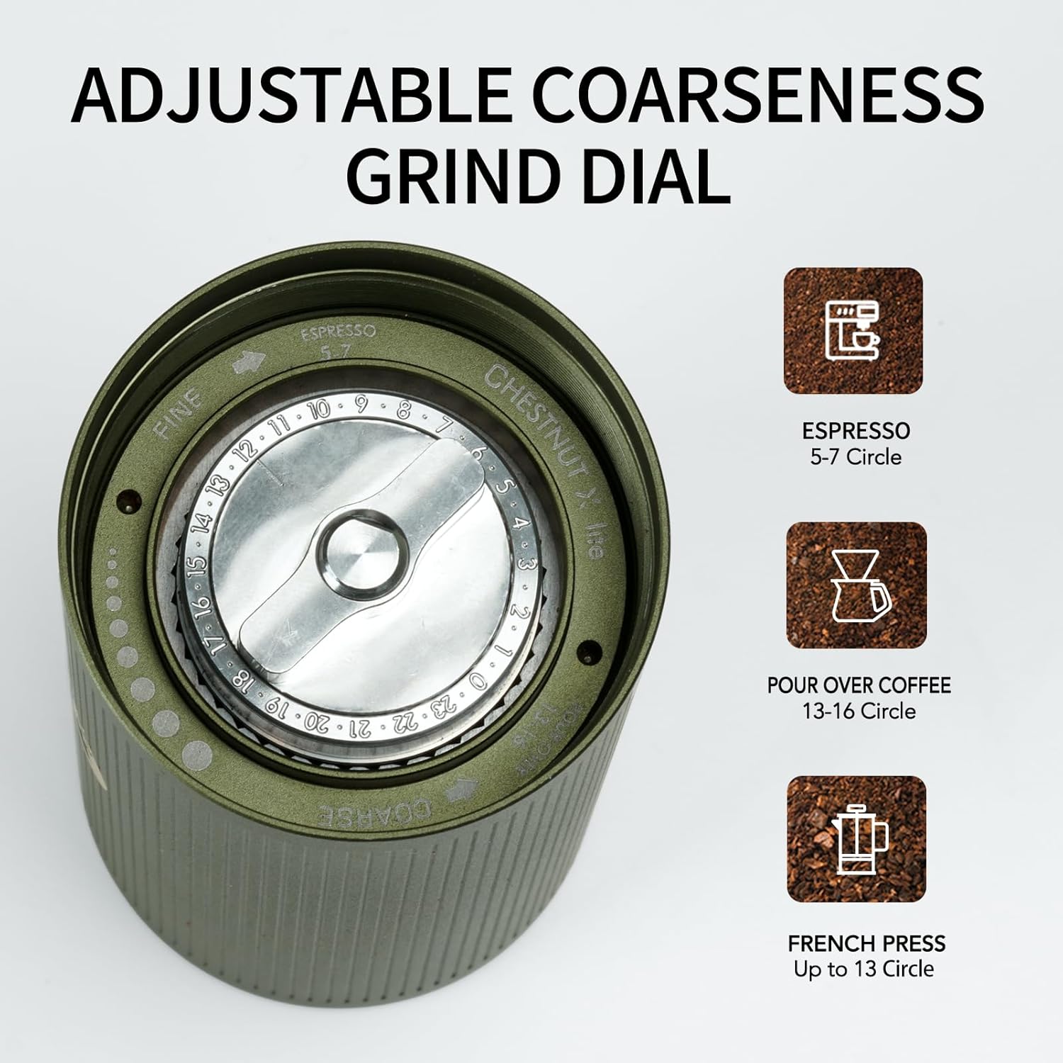 9 reviews for TIMEMORE Manual Coffee Grinder Stainless Steel Conical Burr Coffee Grinder with Capacity 20g Numerical External Adjustable Setting Espressp Grinder for Travel, Camping. Home Chestnut Xlite Green