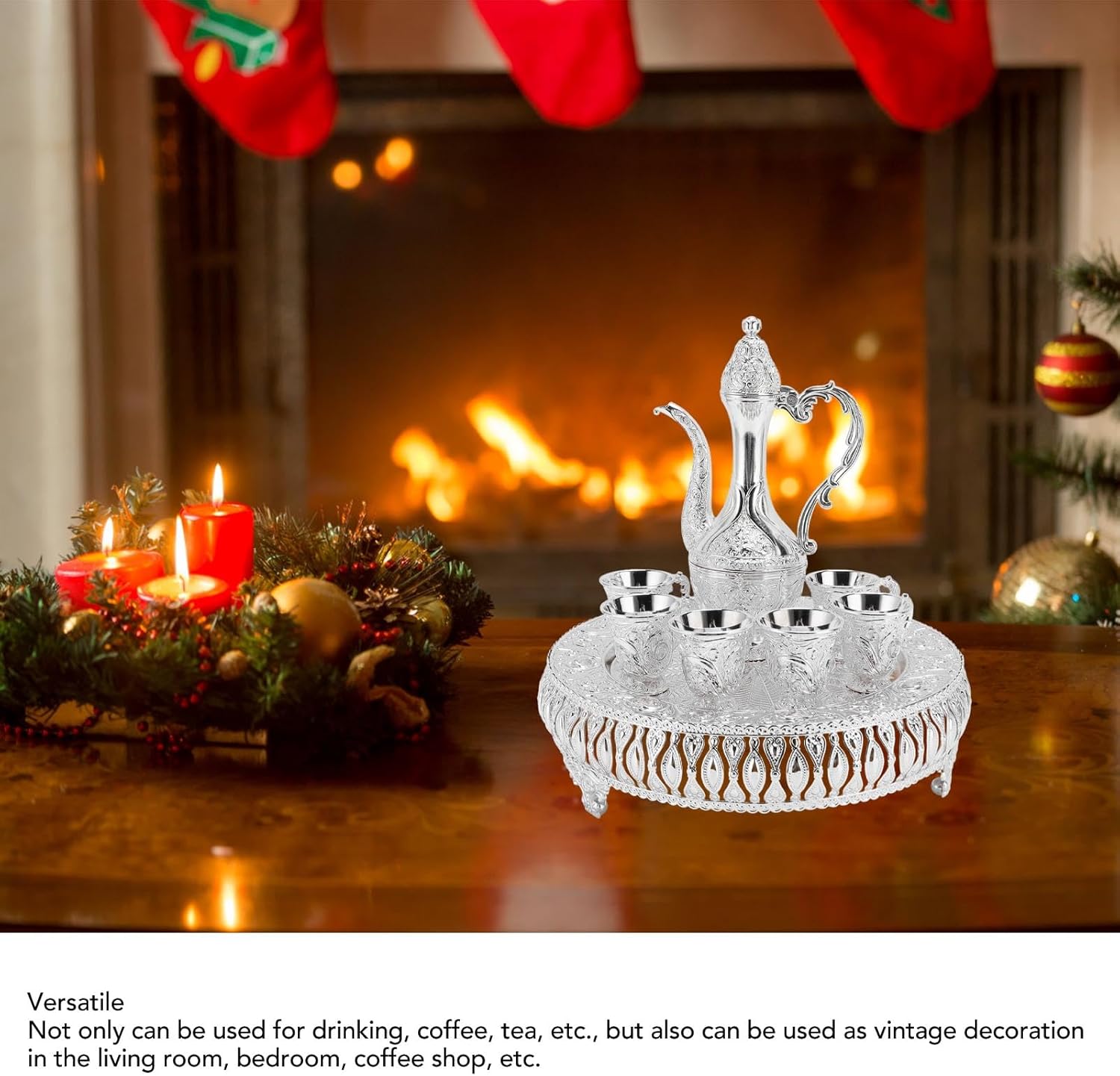 Turkish Tea Set Vintage Wine Pot Set Zinc Alloy Coffee Pot Set with 6 Cups Tray Pot, Retro Wine Pot Kit for Banquet, Gathering, Home, Bar(Silver)