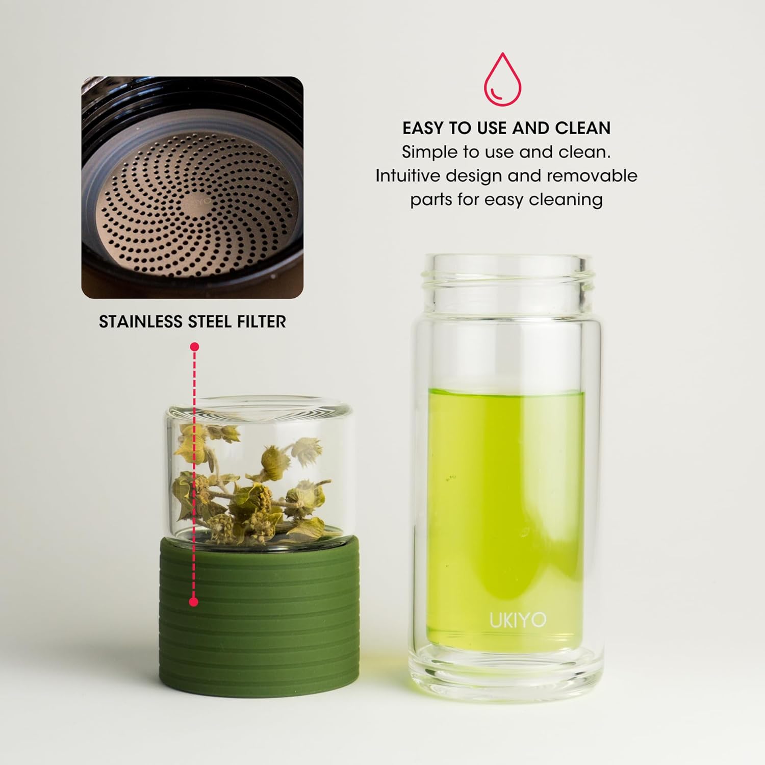 I always get discouraged from drinking my loose leaf tea because tea steepers can be such a hassle. This is a game changer!! I always use it especially while at work because u just pour the water into the larger glass, screw on the small glass (tea part), tilt to steep, flip back over, and unscrew the small glass. Super easy to clean too especially compared to more traditional tea steepers. The leaves donât get caught in the metal part (and the rest is glass).NOTE: the tea end, which is the smaller glass part where you put the loose leaves is NOT double walled, so after your pour your hot water, donât touch it, and be careful when you unscrew it. The drinking part is only double walled.Also NOTE: lots of reviews about it leaking. I had this happen one time but turns out that I screwed the glass on incorrectly. In the manual it says, â The infuser is leaking: Make sure that the UKIYO logo on the stainless filter mesh faces the small glass and the tea leaves.â I always make sure I follow this and never had a leak again. And you do have to tilt the glass at a 45 degree angle to have the water go into the other side. Itâs such a smart, functional design! Couldnât recommend it more!