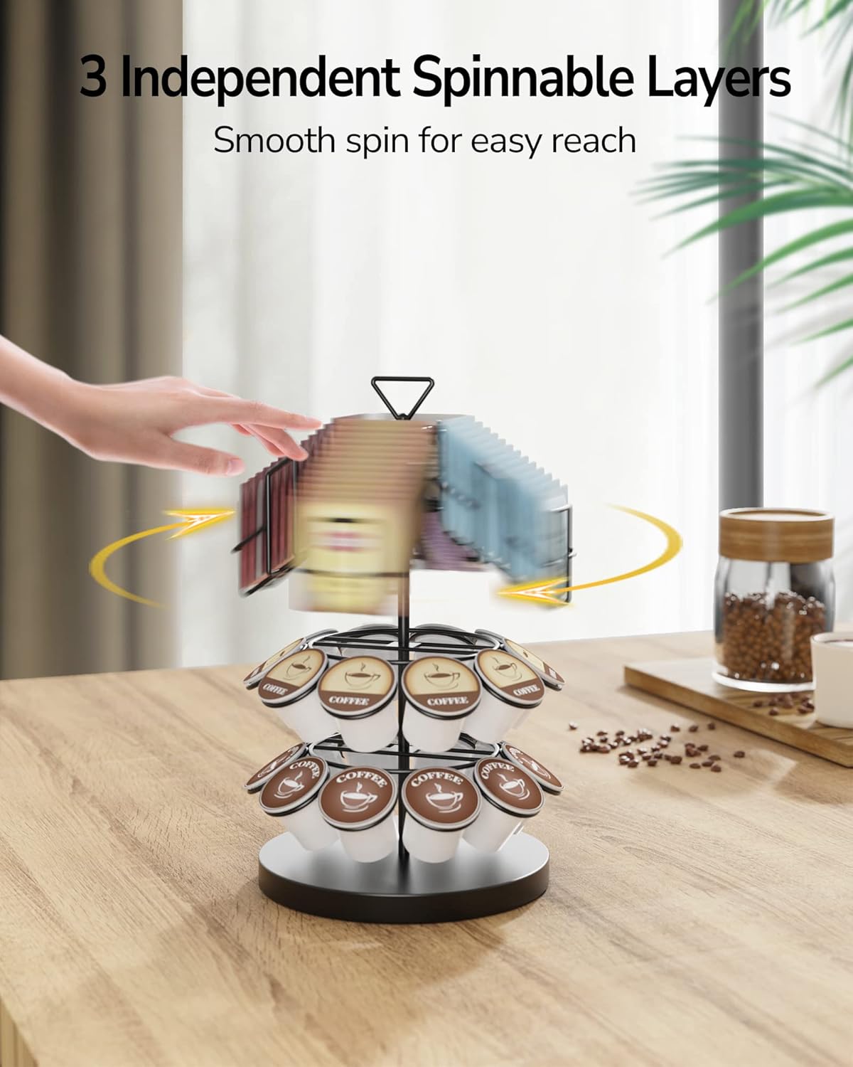 Each Layer Rotatable: The Tea and K Cup Organizer’s 3 layers rotate independently to allow for quick and easy access to your favorite flavors. Stop fumbling through messy cabinets – this Coffee & Tea storage organizer simplifies your routine and keeps your favorites organized at your service.