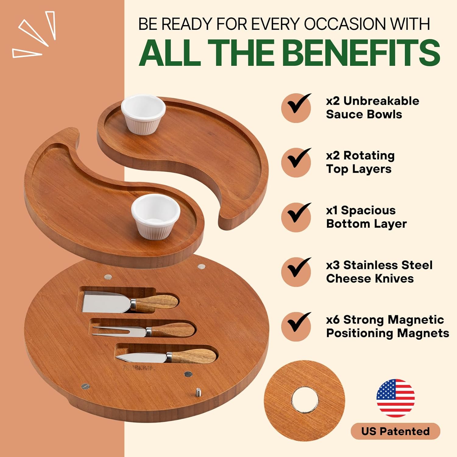 US Patented Double-Layer Charcuterie Board Inspired by Tai Chi | Cheese Board Platter Set w 3 Knives and 2 Bowls | Premium Bamboo Serving Tray | Hoursewarming gift (Mocha Brown)
