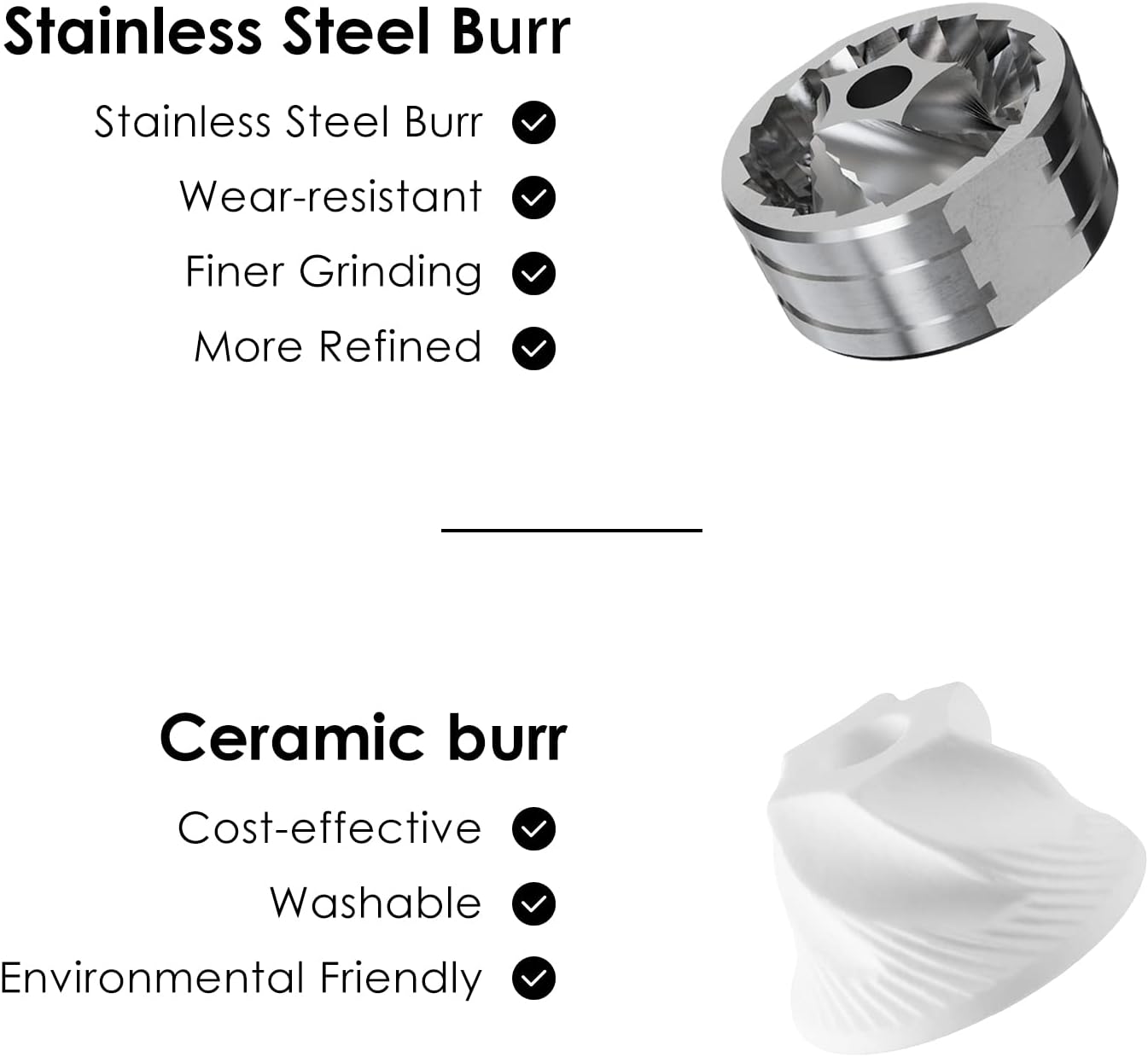 Stainless Steel Burr – Currently, most of burr coffee grinder core is made of ceramic. But stainless steel is becoming increasingly more popular among coffee fanatics. Fast grinding speed, only 60/180 seconds are need. (More fine more time.) The fine grinding speed is very fast, while the whole grinding process is pleasant and labor-saving