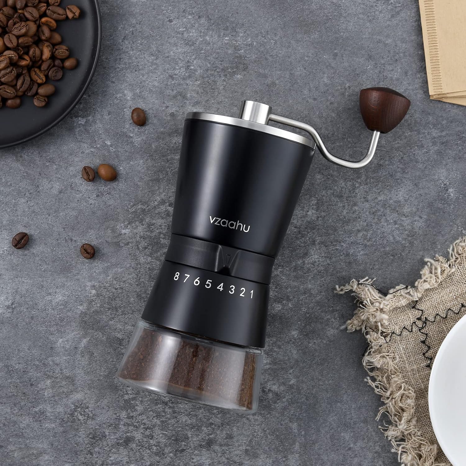 This is a replacement for an old Bialetti hand grinder that because of the plastic grounds receptacle, had broken at one of the latch tabs. (As an aside, the Bialetti is apparently no longer available â no great loss.) The Vzaahu (where in the world did they get this name!?) is much easier to grind than the Bialetti, and the glass receptacle makes it much sturdier. Unfortunately, it doesnât quite allow for a fine (espresso) grind, and for sure youâre not going to get a Turkish grind. At the other end of the spectrum it does fine for French Press grind, and since 98% of the time I use it for a drip coffee maker itâs not a big deal. Also, if you use oily beans itâs necessary to shake the grinder periodically to get the beans to fall into the grinding area. Dry beans donât seem to have this problem. Again, not a big deal.