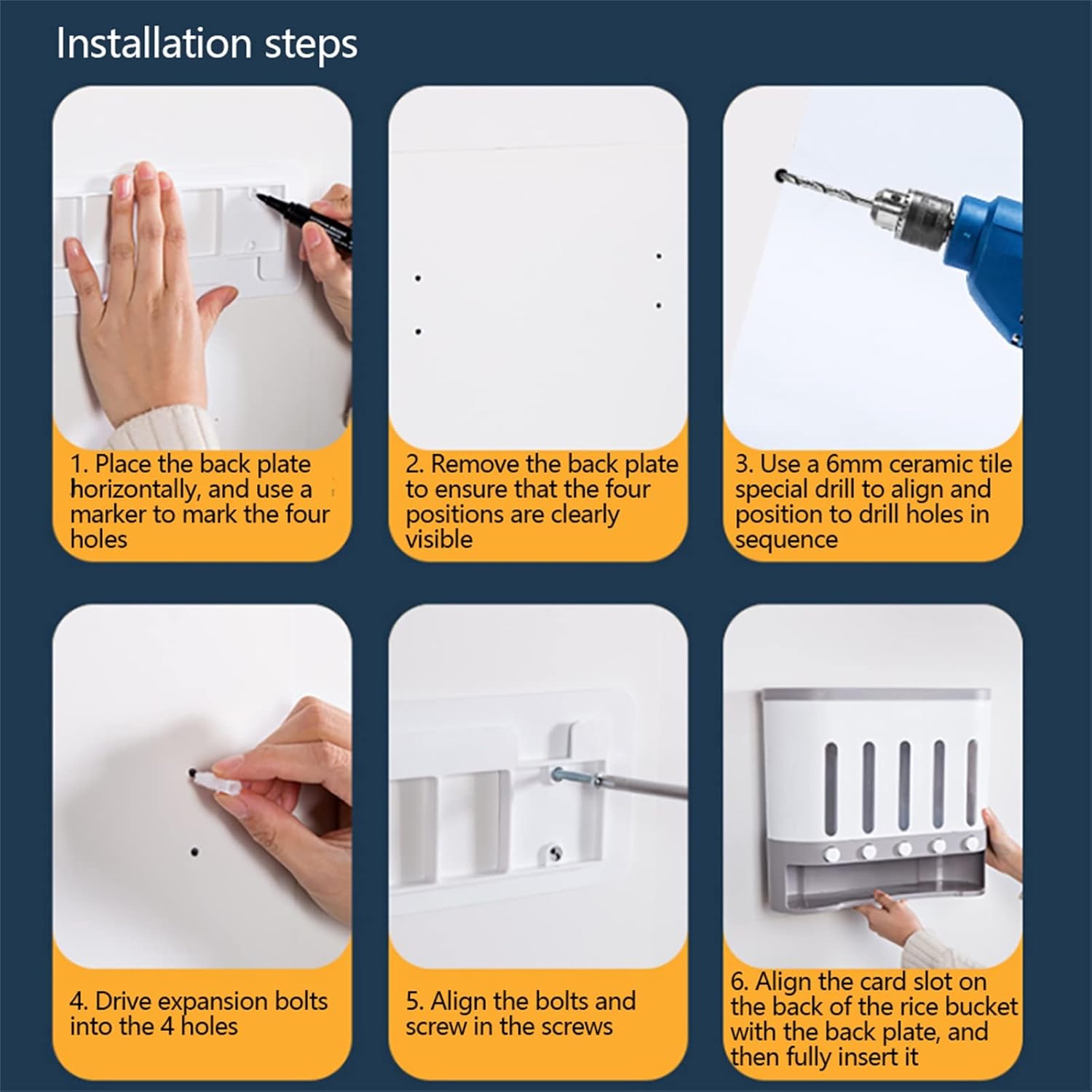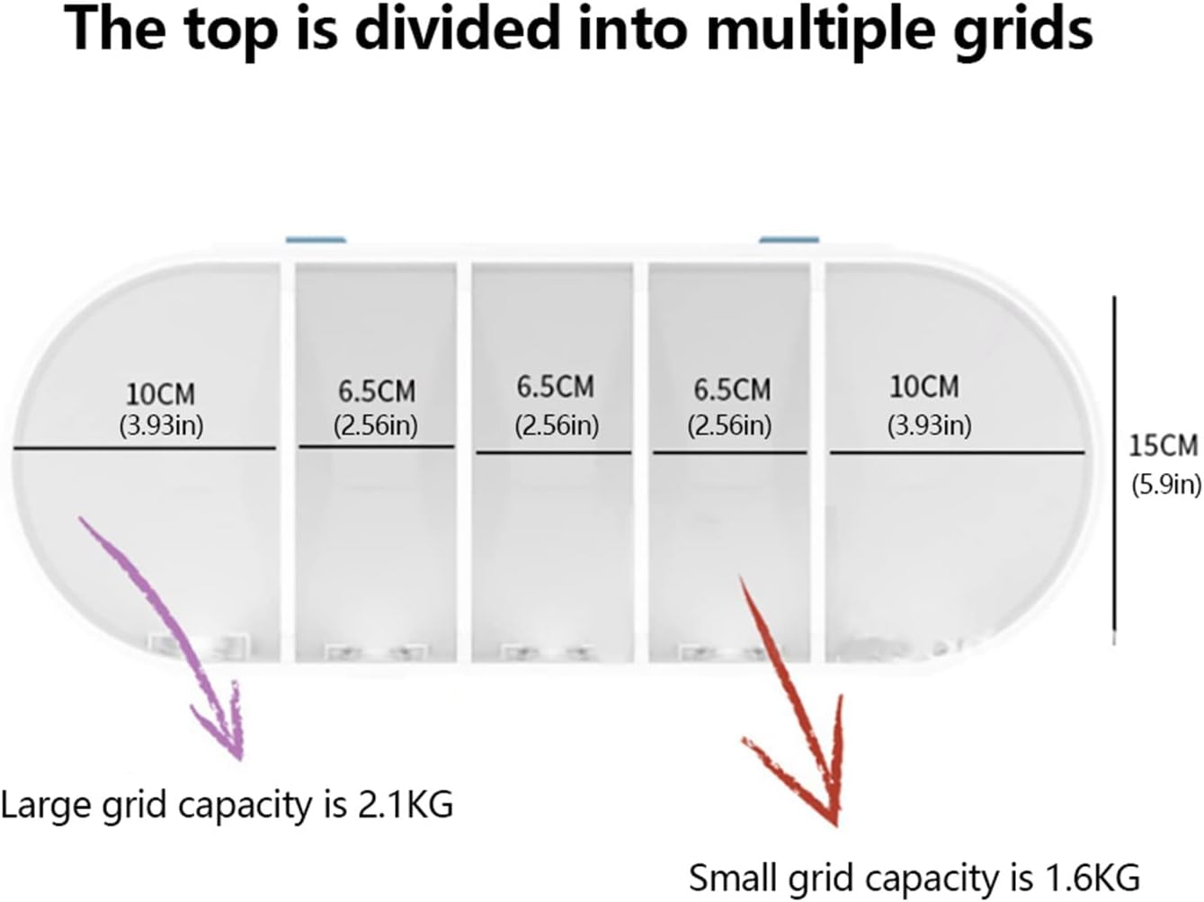 Large Capacity: Large capacity can hold all kinds of dry food. Make your kitchen clean and tidy. The large compartments on both sides can hold 2.1kg of grains, and the middle three small compartments can hold 1.6kg of grains each