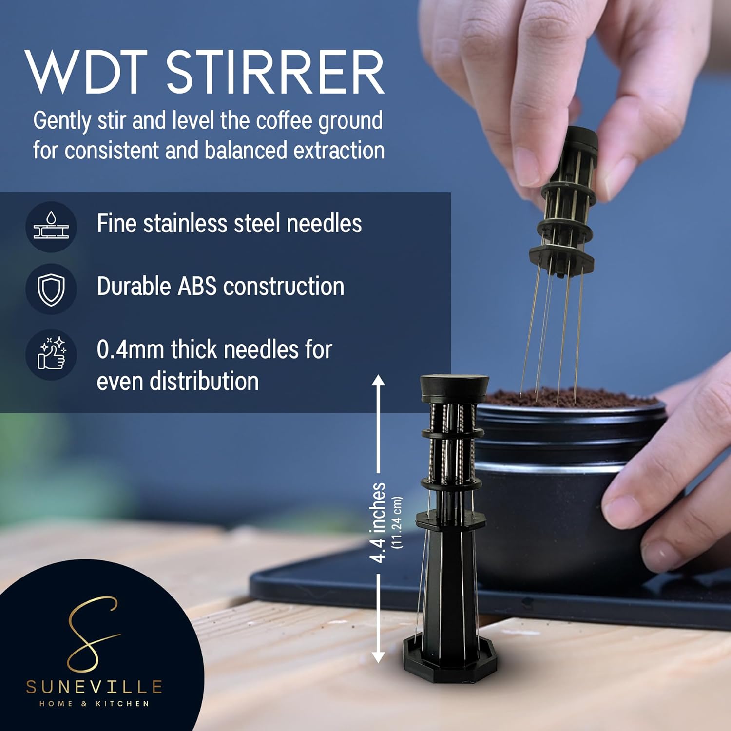 Premium WDT coffee distributor stirrer: Crafted from durable ABS material, our distribution tool boasts a height of 4.4 inches (11.24 cm), making it ergonomic and comfortable to use. We go the extra mile by including a total of 10 needles—8 in use and 2 extra for your convenience.