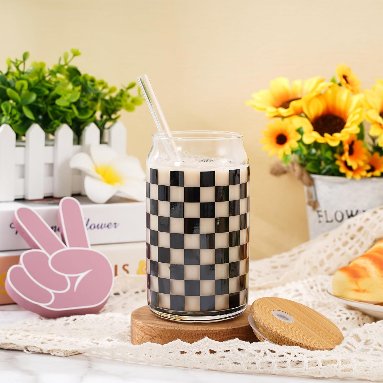 Whaline 2 Pack Checkered Drinking Glasses 16oz Black Checkered Glasses Cup Ice Coffee Cup with Bamboo Lid Glass Straw Cleaning Brush for Race Car Party Drink Decoration Gifts