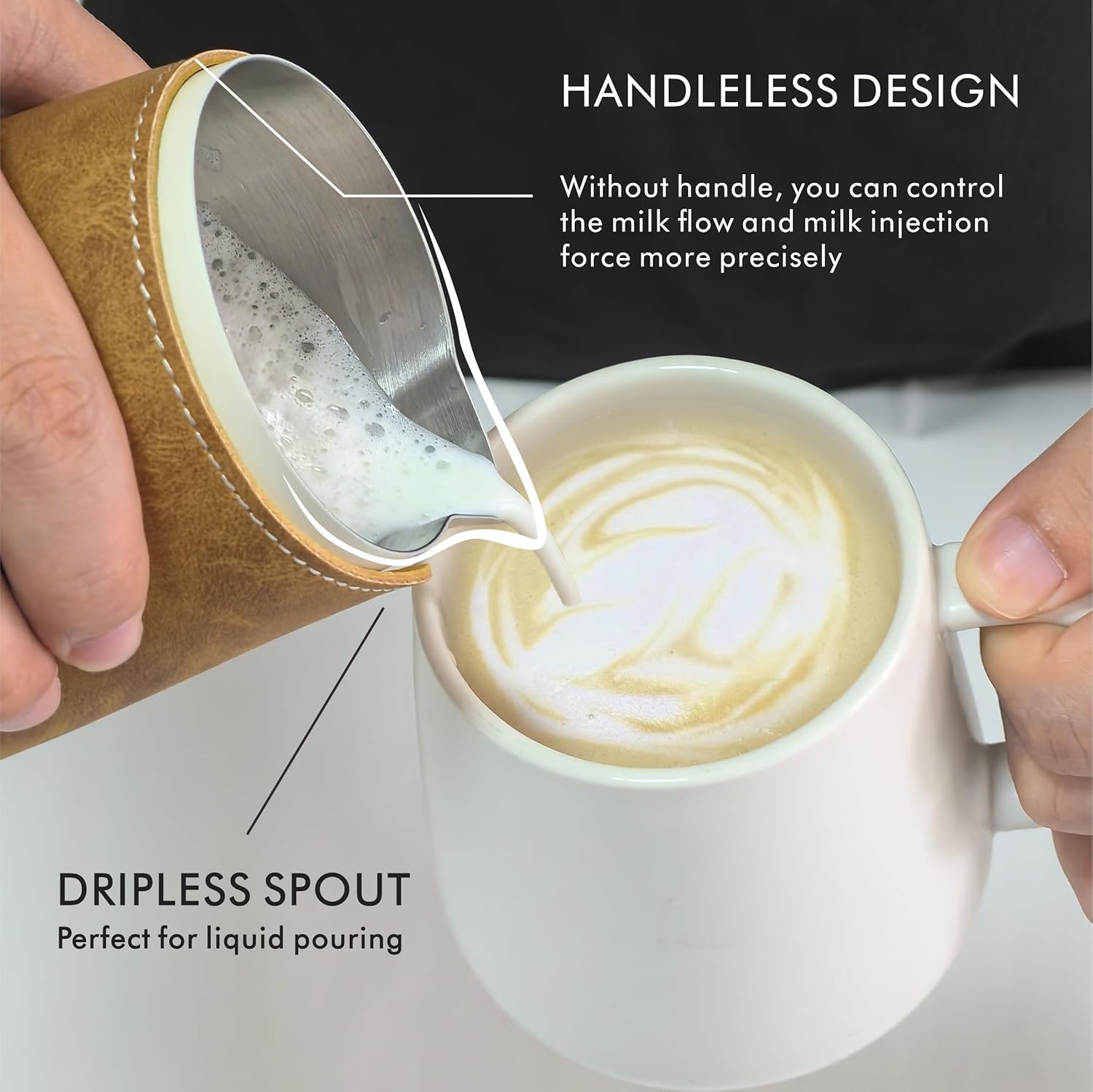 HANDLELESS DESIGN: Without handle, you can control the milk flow and milk injection force more precisely, especially suitable for convection embossing patterns and slow shaking patterns. The heat-proof pure genine cowhide cover is specially designed for this milk frothing pitcher, which fits seamlessly, you will feel very comfortable to hold.