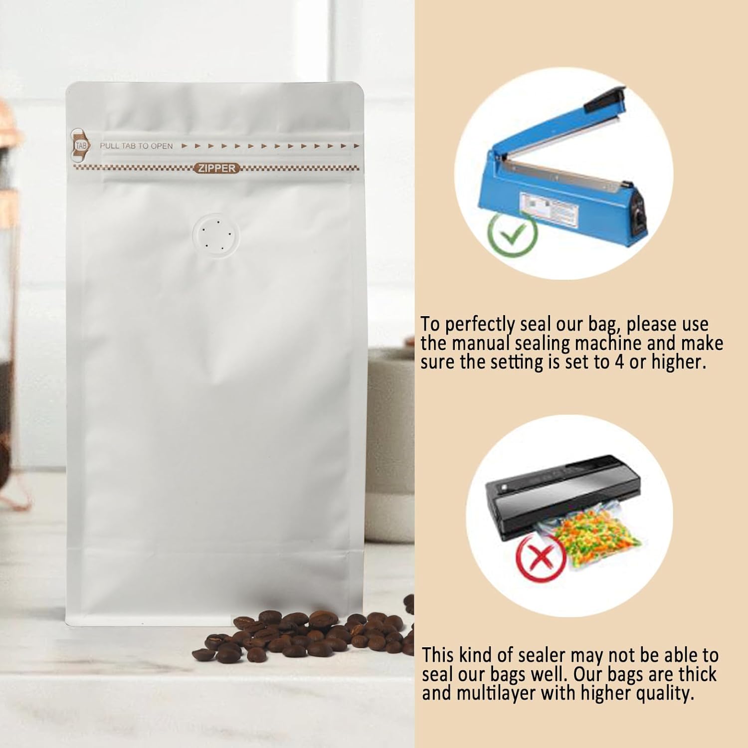 Resealable – Resealable side zipper keeps half-used coffee fresh. Also makes our bags reusable. Please be aware that after adding coffee, the bags should be sealed with a heat sealer, otherwise they will not be usable. Item size: 5 x 9.25 x 2.5″, for 12oz/0.75lb/340gram coffee beans or ground, Pack of 50.