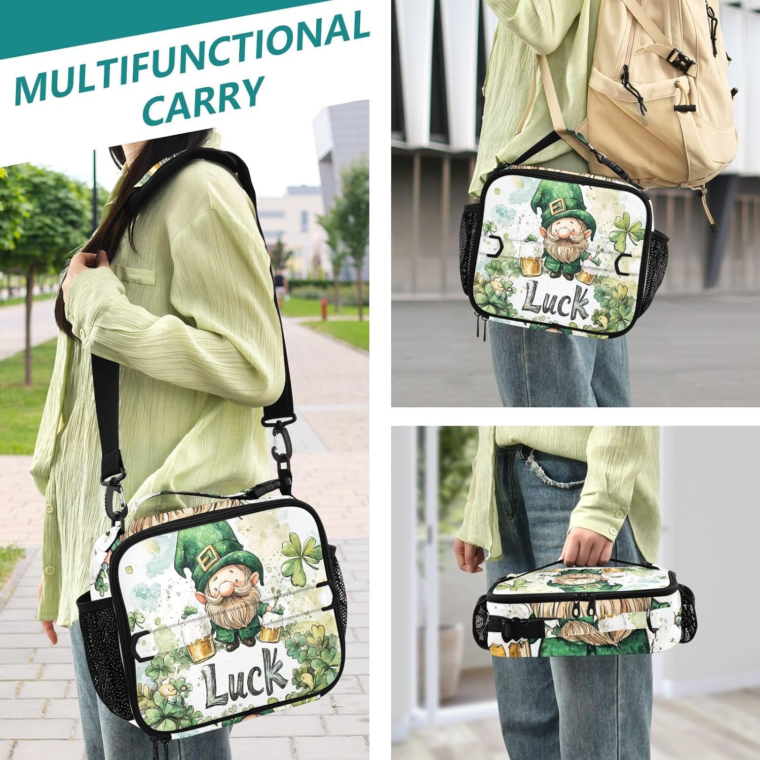 Flexible and Convenient Carrying Methods:Equipped with dual handles, mesh side pockets, and an adjustable shoulder strap, this Lunch Tote Bag can be carried by hand or worn crossbody. Its handy buckle handle makes it easy to attach to other luggage for extra convenience.