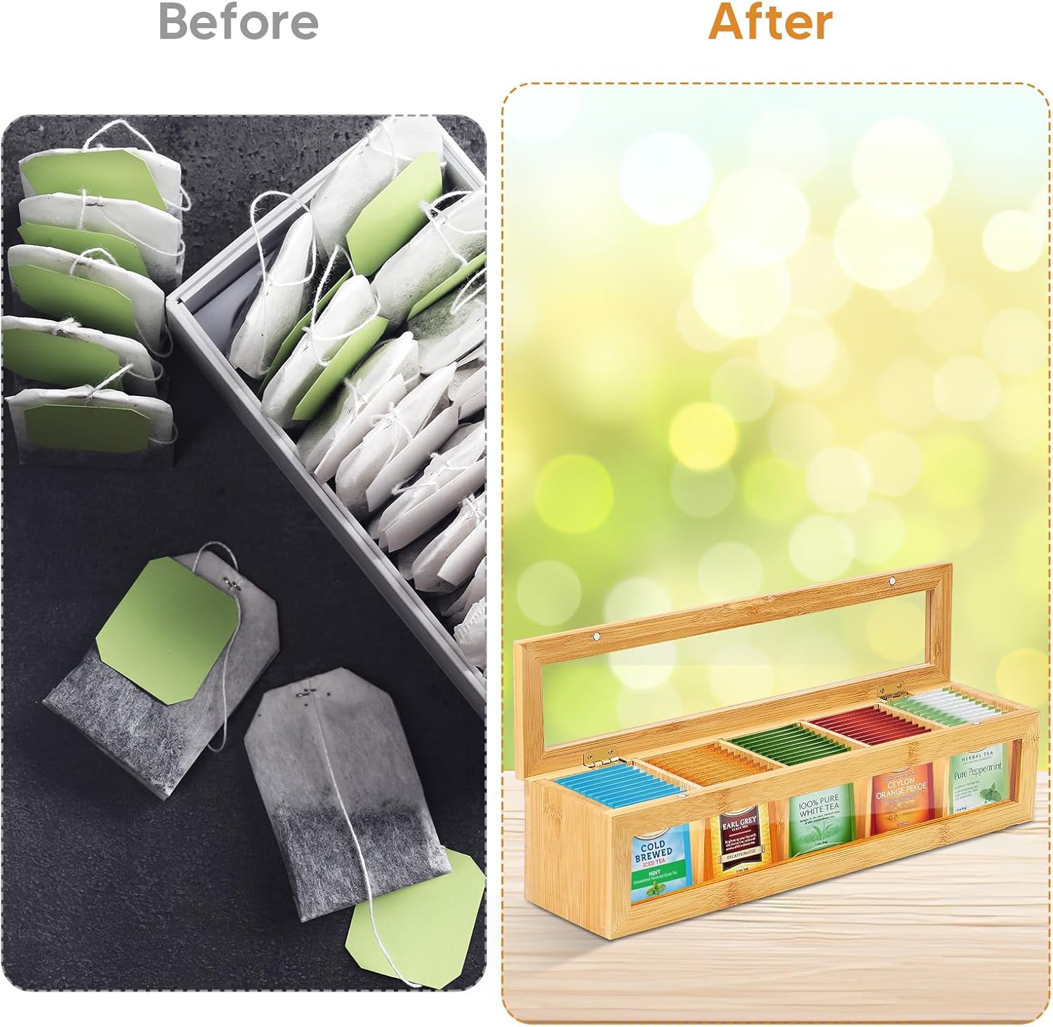 Wooden Tea Bag Organizer,Bamboo Tea Box with 5 Compartments,Acrylic Window and Magnetic Lid,Countertop Divided Tea Storage Container,Tea Bag Holder for Tea,Sugar Packets