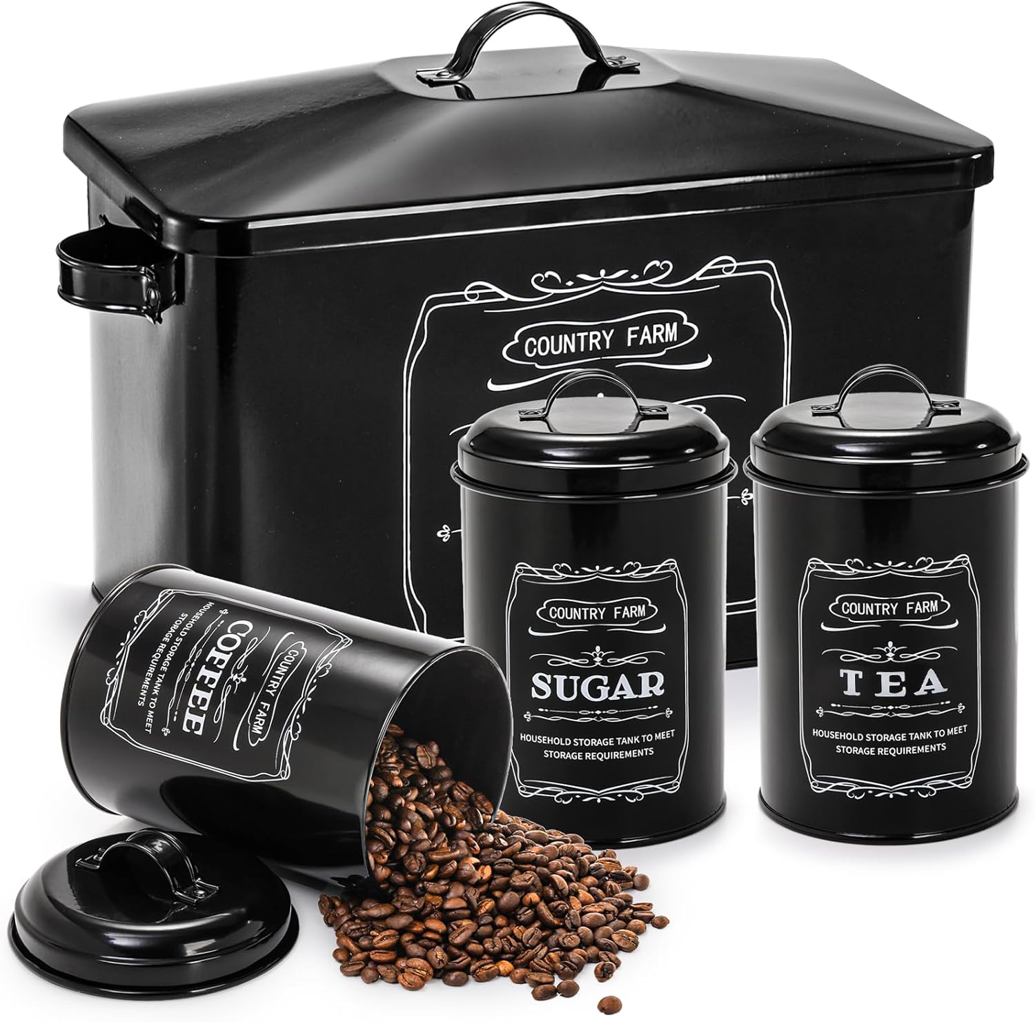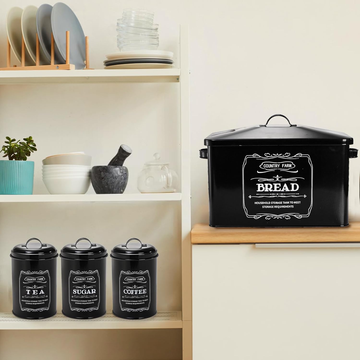 yarlung Metal Bread Box with 3 Kitchen Canisters Set, Large Black Farmhouse Bread Tin for Kitchen Countertop, Coffee Tea Sugar Canister with Lid for Pantry Organizer Home Storage