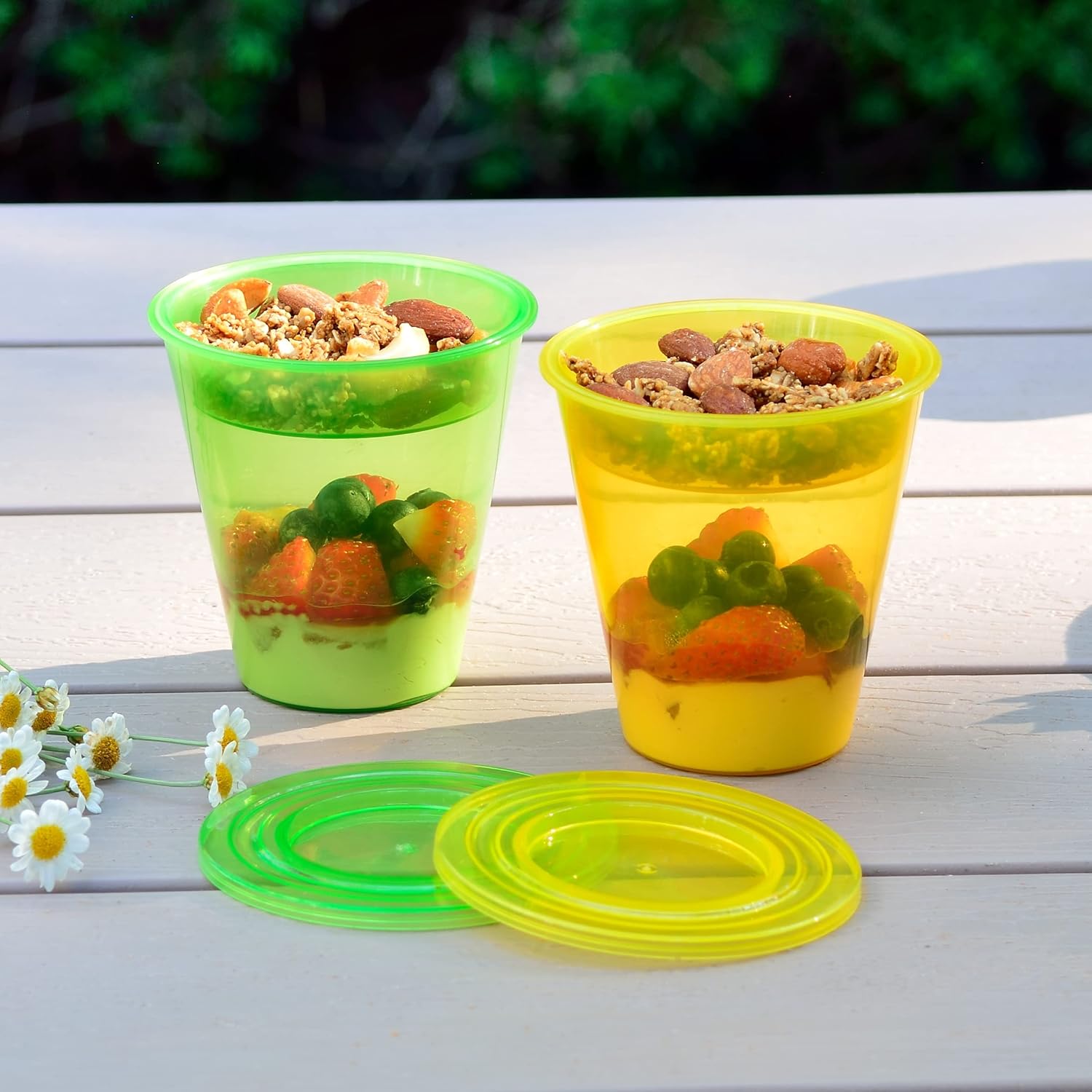 I bought these for my boyfriend to help with his meal preps. (Fruit, yogurt, granola) they work well, easy to clean and everything stays fresh. Granola stays crunchy even after a few days. Wish they were different colors so they didnât look like kids cups, but they work!