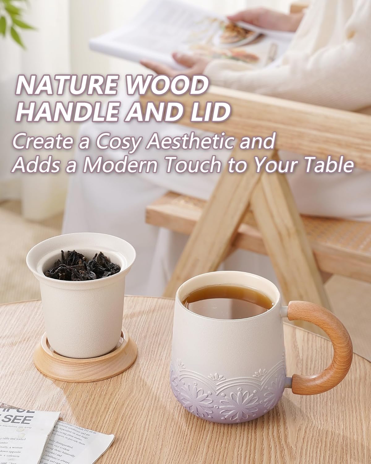 JAPANDI WOOD HANDLE AND LID: The artistic bits of this tea mug would have to be the specially beech wood handle, the ergonomically-designed arc that allows you to comfortably and securely grip. The wooden lid keeps the tea warmer and the tea aroma long-lasting. it’s also doubles as a coaster to catch drip tea after finished steeping. the nature wooden features create a cosy aesthetic and adds a modern touch to your tea and coffee table.