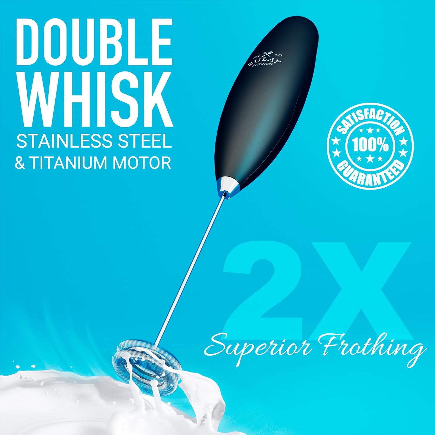PROVEN & TRUSTED QUALITY: We use only premium materials. Our Double whisk milk frother will not rust or break, ever. Built to last. Our small and efficient frother works on all types of milk – half and half, creamer, soy, almond, cashew, hazelnut, whole milk, and other dairy such as butter or cream.